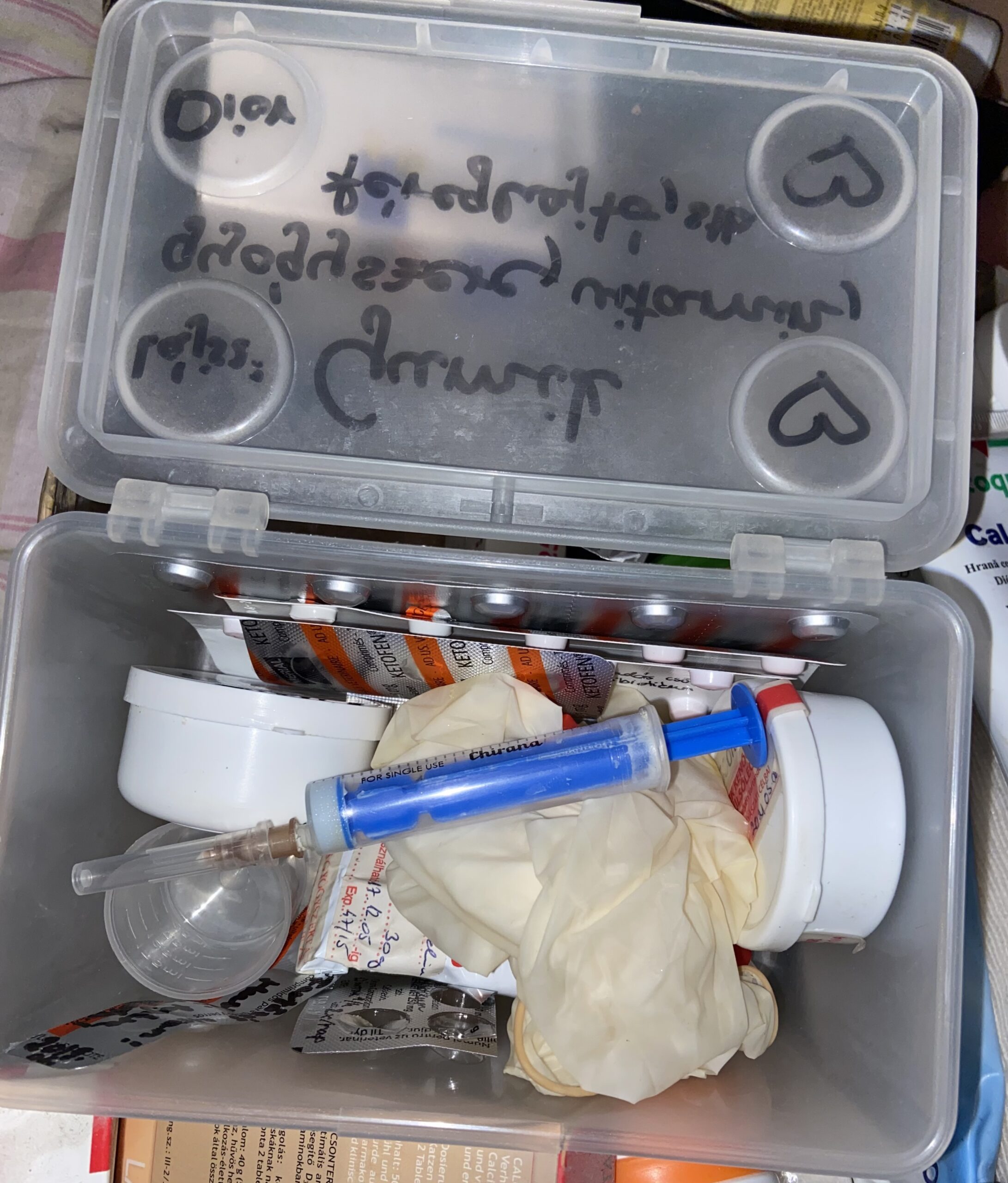 Abban a zűrzavaros dobozban pedig mindenféle gyógyszer van vészhelyzetre, amit dokikkal írattam fel és váltottam ki, inkább legyen itthon, minthogy ne legyen, ha gond van.