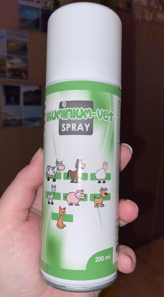 Ez az Aluminium-Vet Spray egy nagyon fasza dolog. Állatoknak kifejlesztett fertőtlenítő spray, amit nyílt sebre és műtét után is lehet fújni, ebből adódóan harapásra, horzsolásra is. Amúgy emberekre is használható, nagyon széles spektrumú és univerzális fertőtlenítő és ha lenyalja sem lesz baja. Ha a kutyára fújom, rendesen ezüst színű lesz tőle a bőre, mint az aluminium.