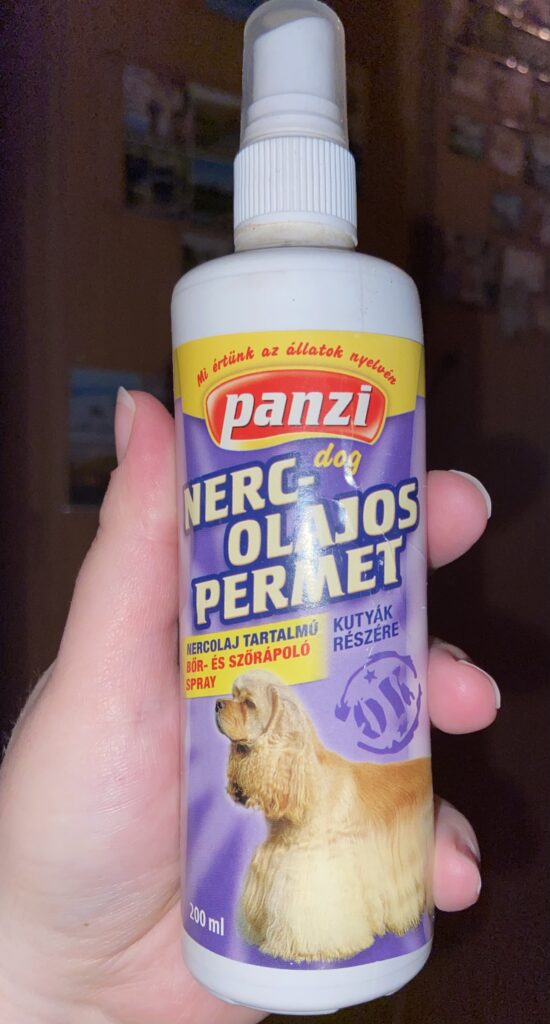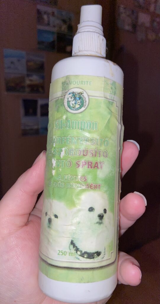 Sajna itt az egyik szőrápoló spray kifolyt és elmosta a nevét meg az infókat, de a lényeg, amit tudni kell róla: igen, szép lesz a szőre a kutyának, igen, csillogós lesz, igen ráfújnám talán egy kiállításon, de soha többé. Utána olyan ragacsos lesz a szűrük és annyira felveszi a port, hogy szerintem nem érdemes ilyenekkel fújkálni a kutyát.