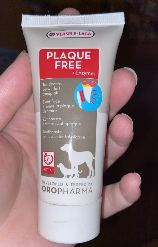 A Plaque Free cucc egy fogkrém, kifejezetten kutyáknak, a fehér kis ujjra húzható bigyó pedig egy puha gumi kefés kutya fogkefe, érdemes kipróbálni, hátha beválik, ha valaki nagyon fogköves vagy szuvasodik a kutyusotok foga, nekem Hurkin már nem segített, neki minden foga nagyon rossz volt és végül folyamatosan húzni kellett.