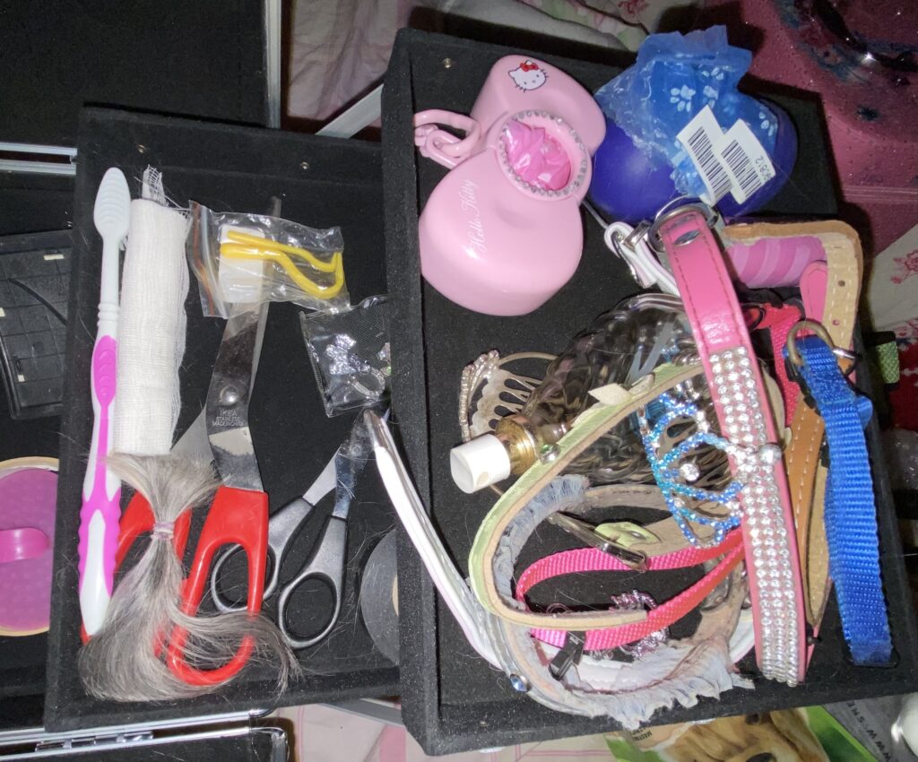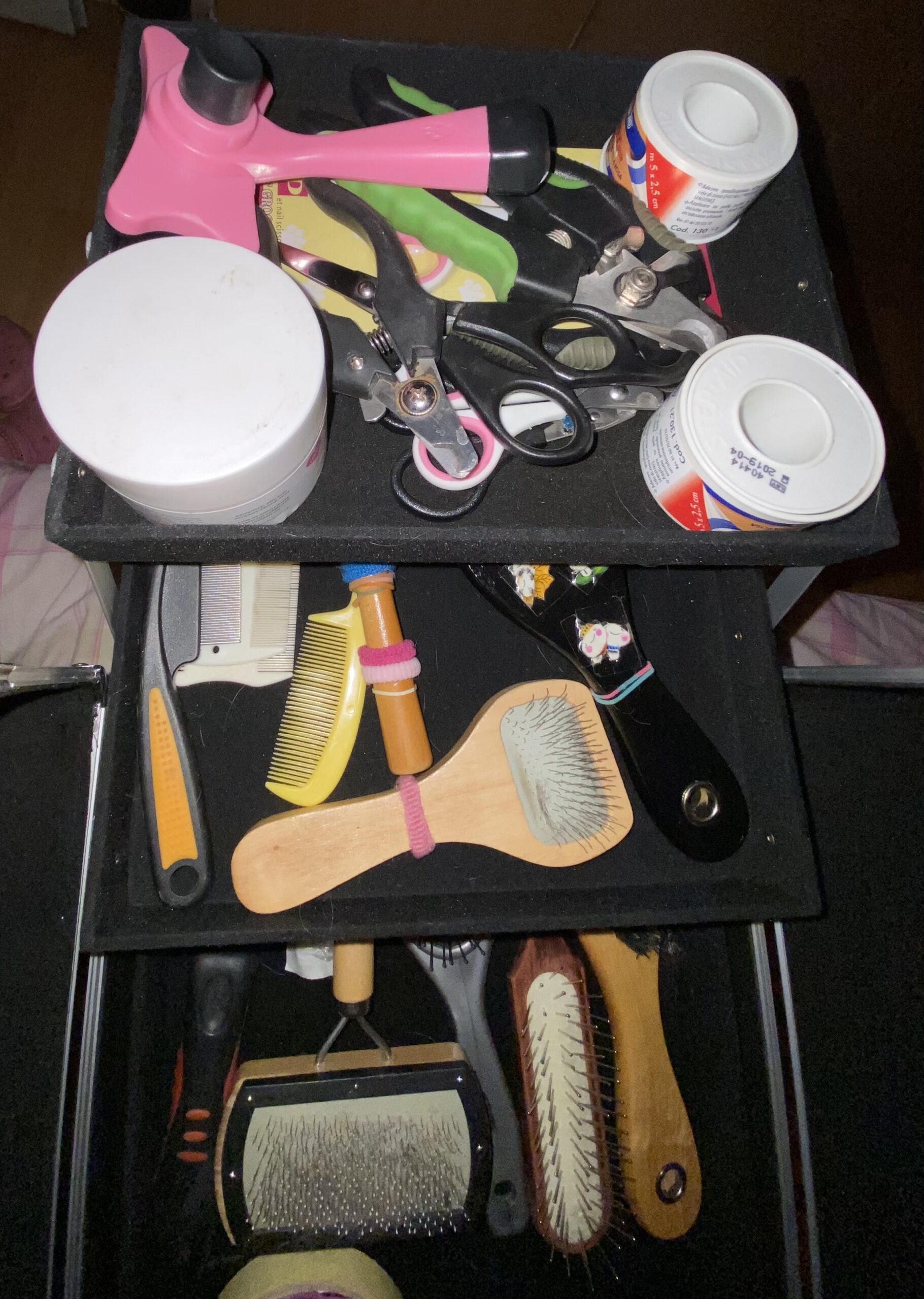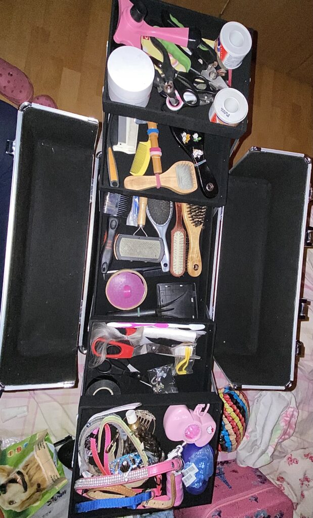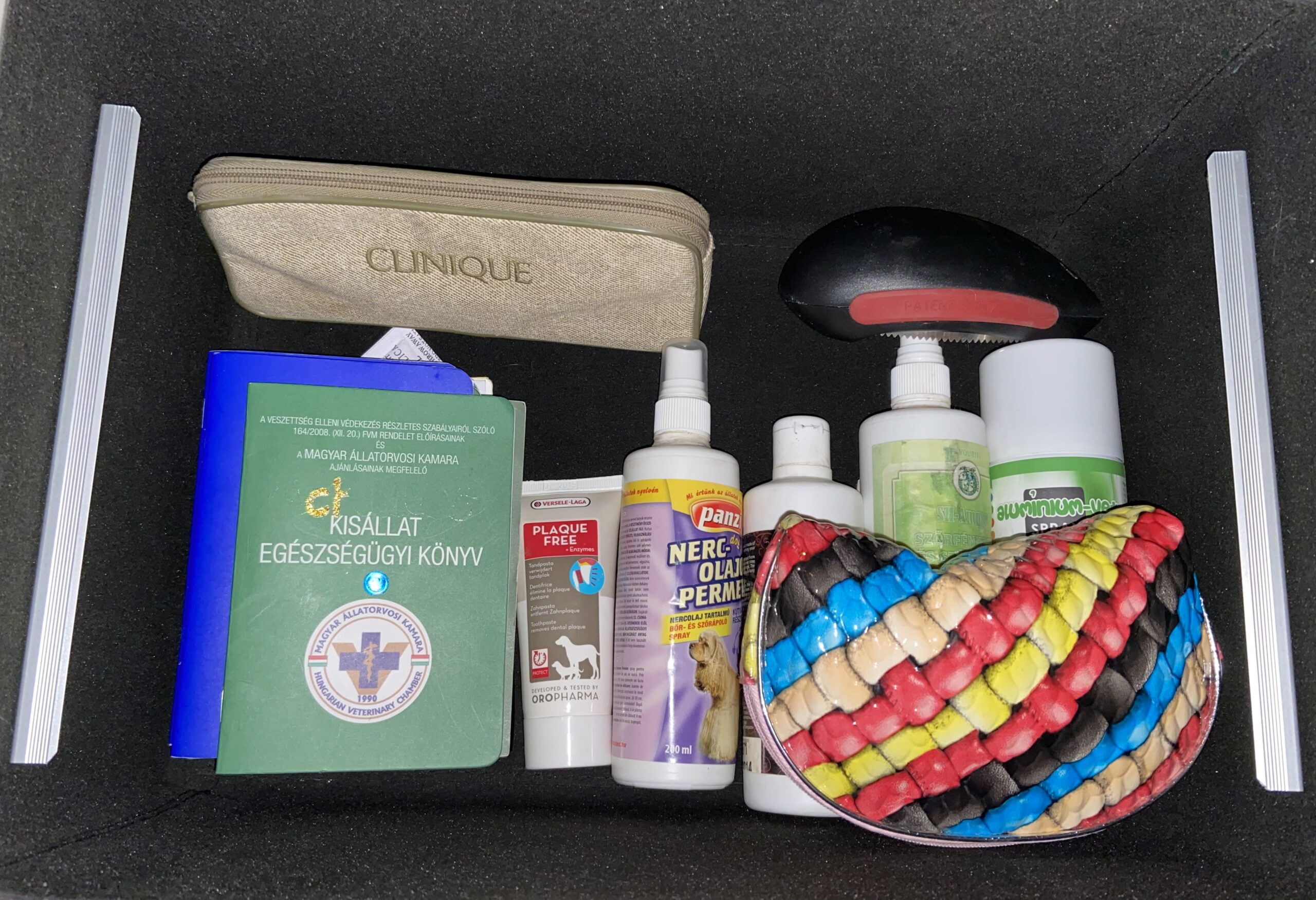 Aztán van itt minden szokásos kozmetikai kellék: fésű (ezt ajánlom, szerintem az egy soros, meg a többi nem csak tépi, de felesleges is, semmit sem érnek, ez a drótos a legjobb!), ritkító olló, olló, kölyök fülragasztáshoz orvosi ragasztó, körömvágó ollók, kicsi nyírógépek (szemkörnyék, fül, talp, popsi, genitáliák nyírásához remek) és olló.