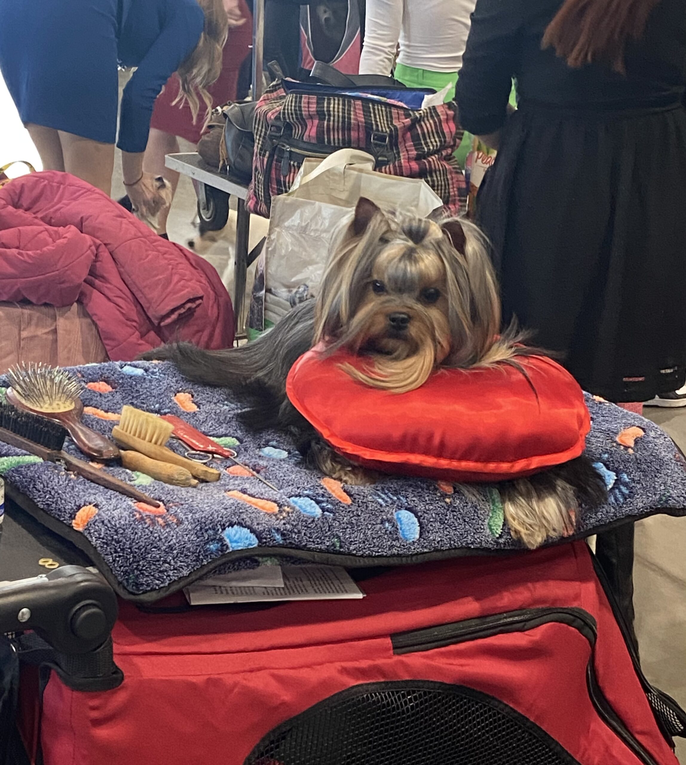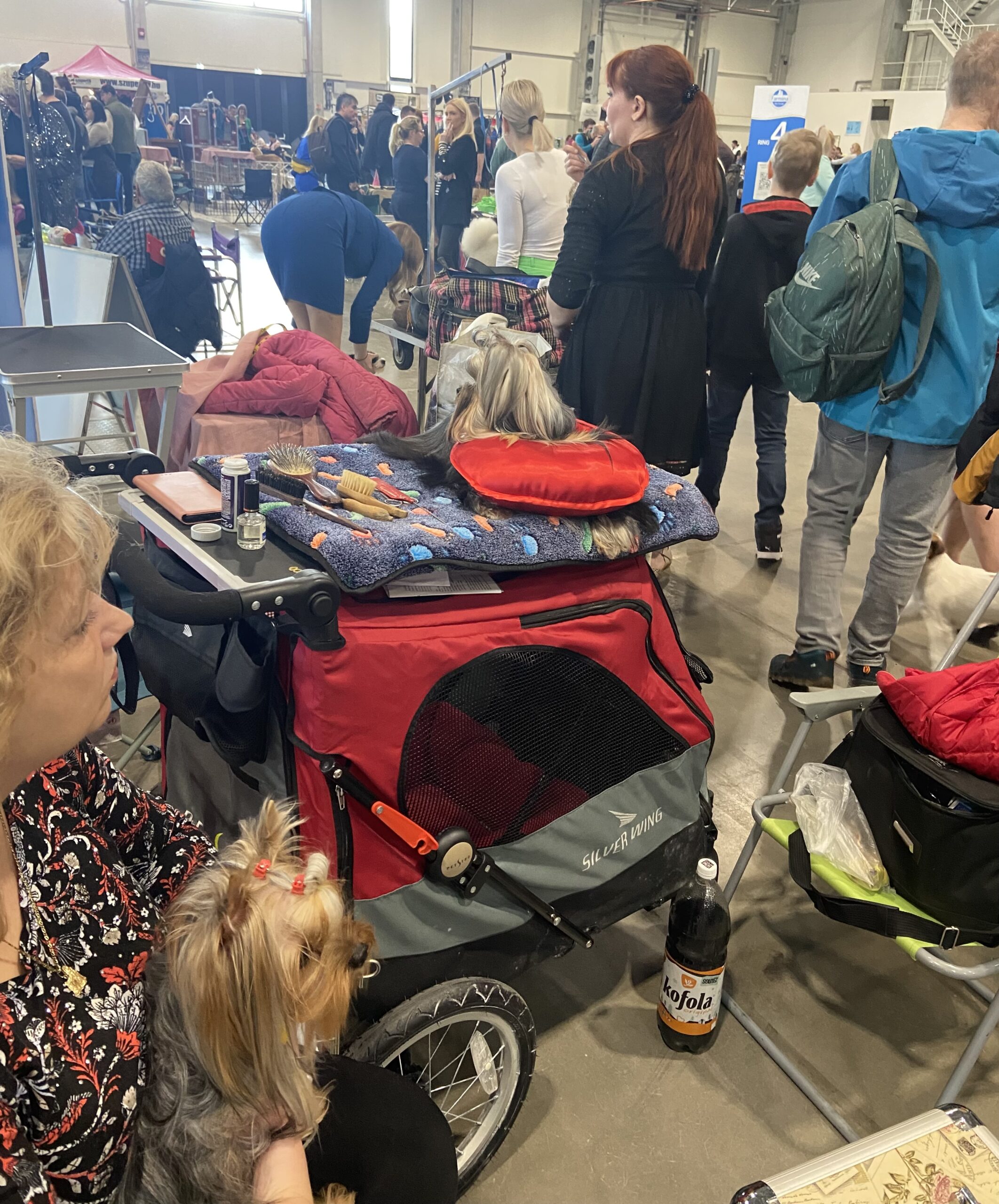 A rengeteg kiállító között próbáltuk megtalálni a Yorkisokat, akartam kicsit beszélgetni a gazdákkal, ismerkedni, infót cserélni. Pl. ez a nyakpárna, amin ez a kutyus fekszik, vagy talán fésülködős párna (nem tudtam megkérdezni a párna nevét, szlovák volt a gazdája) baromi jó ötlet, régebben nem láttam ilyesmit a hazai kiállításokon.