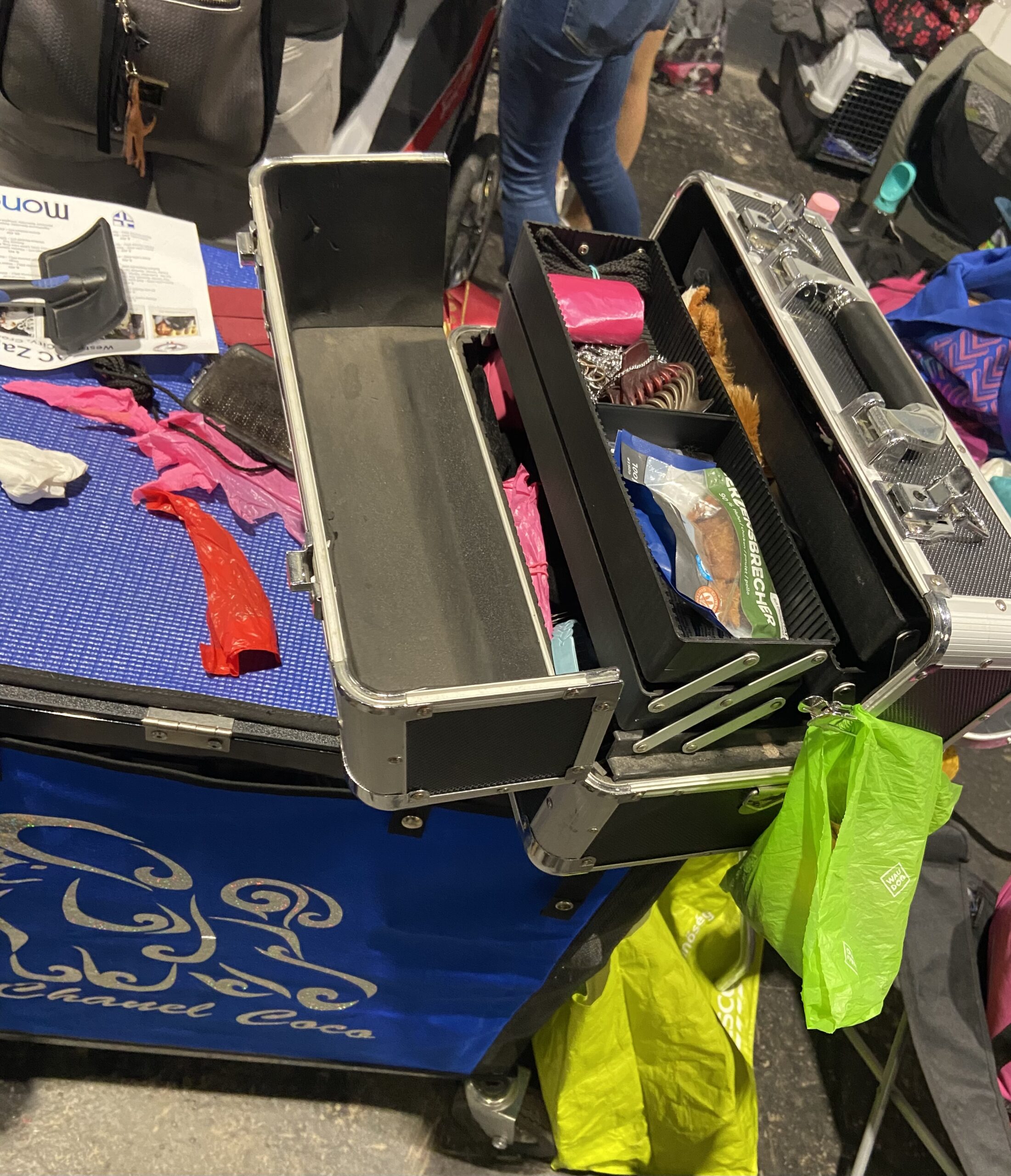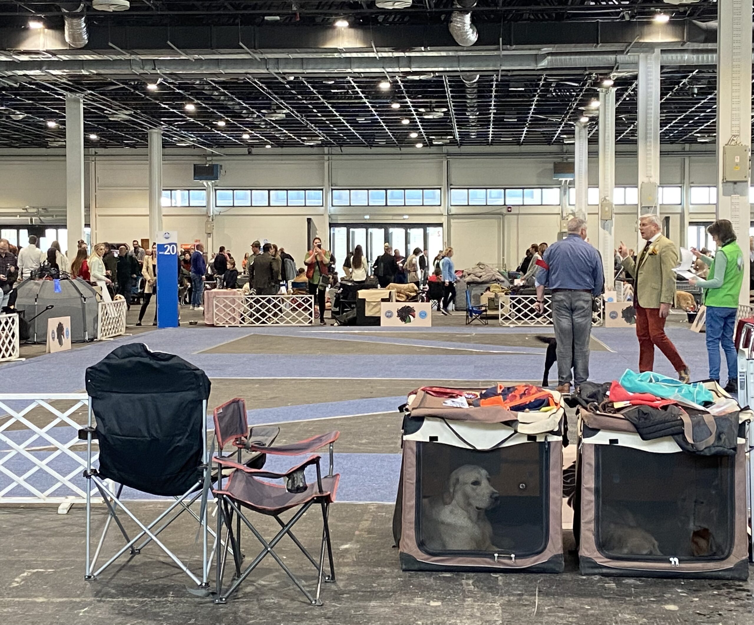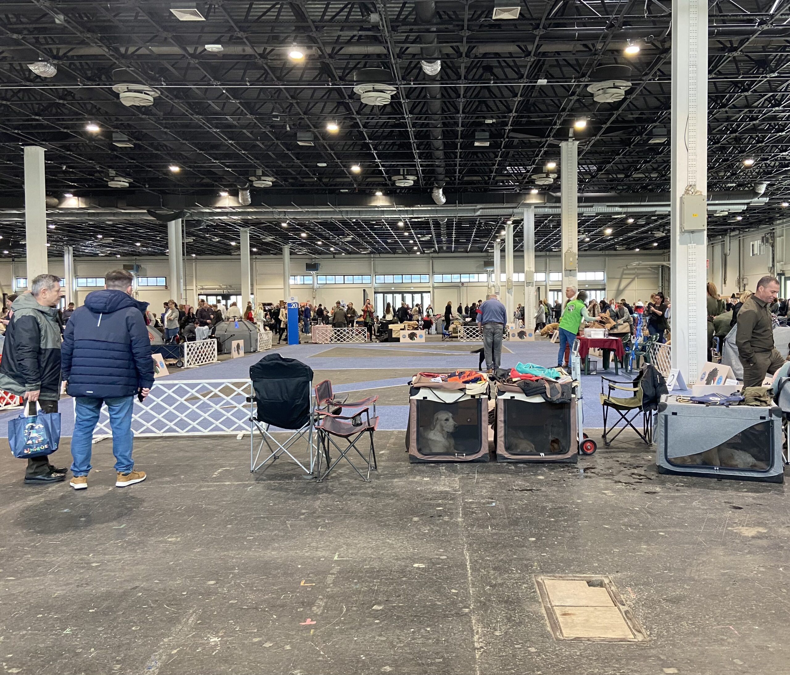 Középen a kék rész a ring, oda csak kiállítók mehetnek vagy a szünetekben gyakorlók. Körülötte a kiállítók tanyáznak kempingszékeken, kutya boxokkal, ketrecekkel, kutya(baba)kocsikkal, hordozható kozmetikai asztalokkal, stb.